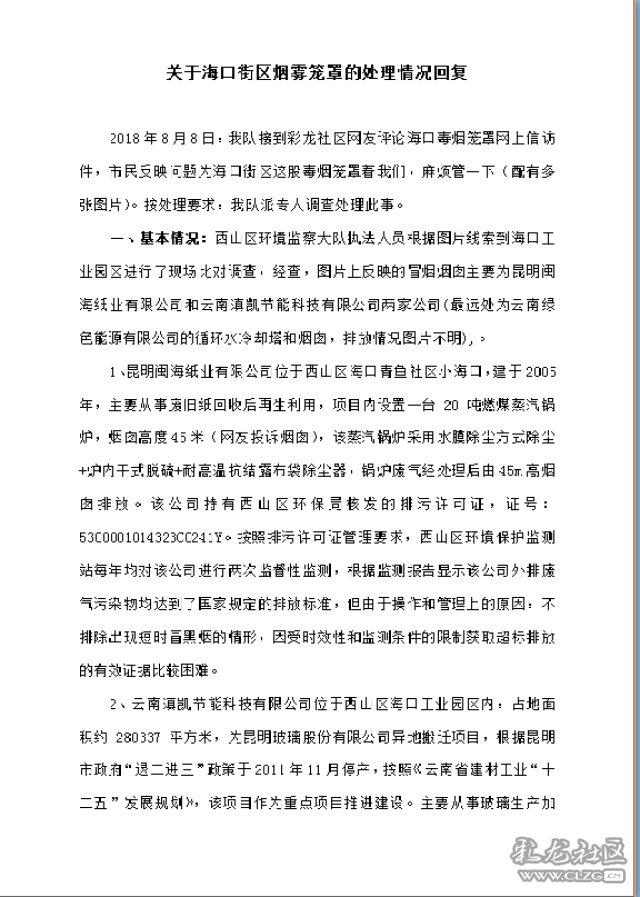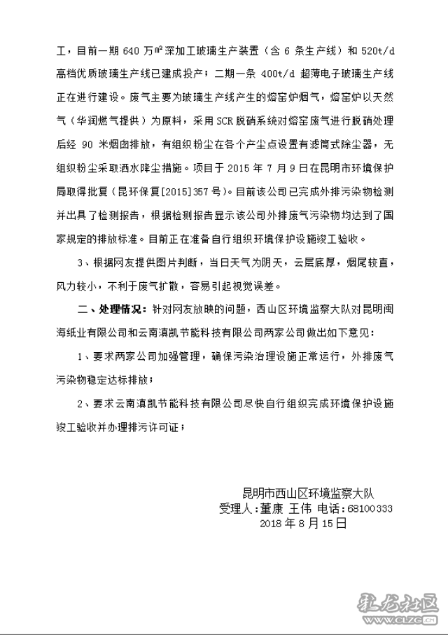 一周后,西山區(qū)環(huán)境監(jiān)察大隊針對該事件做出書面回應(yīng)《關(guān)于??诮謪^(qū)煙霧籠罩的處理情況的回復(fù)》?;貜?fù)稱“西山區(qū)環(huán)境監(jiān)察大隊執(zhí)法人員根據(jù)圖片線索到??诠I(yè)園區(qū)進(jìn)行了現(xiàn)場比對調(diào)查。經(jīng)查,圖片上反映的冒煙囪主要為昆明閩海纖業(yè)有跟公瓦和云南滇凱節(jié)能科技有限公司兩家公司所有(最遠(yuǎn)處為云南綠色能源有限公司的循環(huán)冷卻塔和煙囪,排放情況圖片不明)”,隨后,監(jiān)察大隊對兩家公司進(jìn)行了深入調(diào)查。最終處理情況回復(fù)為“針對網(wǎng)友反映的問題,西山區(qū)環(huán)境監(jiān)察大隊對昆明閩海紙業(yè)有限公司和云南滇凱節(jié)能科技有限公司兩家公司做出如下意見:1、要求兩家公司加強管理,確保污染治理設(shè)施正常運行,外排廢氣污染物穩(wěn)定達(dá)標(biāo)排放;2、要求云南滇凱節(jié)能科技有限公司盡快自行組織完成環(huán)境保護設(shè)施竣工驗收并辦理排污許可證?!?/p>