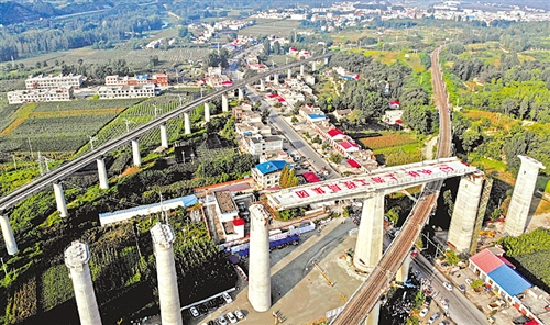 8月14日,蒙華鐵路峽河特大橋跨越寧西鐵路曲線梁轉(zhuǎn)體成功。蒙華鐵路峽河特大橋位于河南省南陽市境內(nèi),全長879米。蒙華鐵路北起內(nèi)蒙古鄂爾多斯,終至江西吉安。(新華社發(fā))