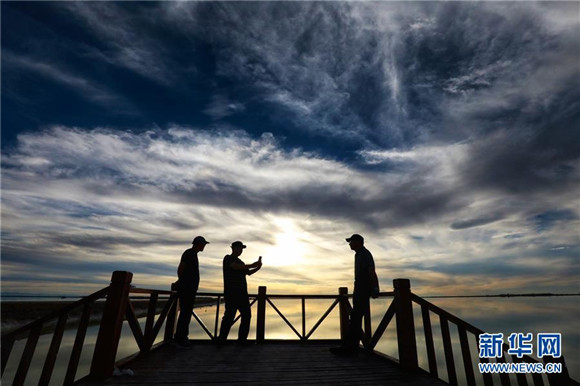 察爾汗鹽湖棧橋上,游客在游覽拍照 新華社記者田文杰 攝