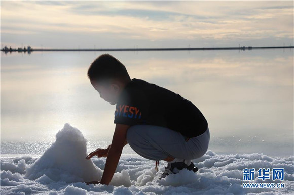 小朋友在察爾汗鹽湖邊堆鹽堆 新華社記者田文杰攝