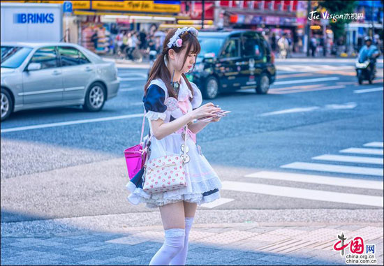 在不遠(yuǎn)處有一位身穿女仆裝的促銷女孩,她向每一位過(guò)路的游客散發(fā)店鋪促銷廣告。和那位“龜仙人”完全是一個(gè)天堂,一個(gè)地獄。