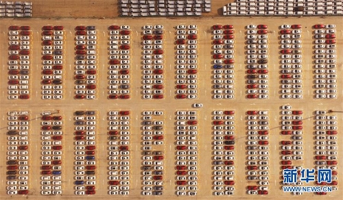 重慶果園港內(nèi)停放著等待運(yùn)輸?shù)钠?chē)(8月20日無(wú)人機(jī)拍/攝)。