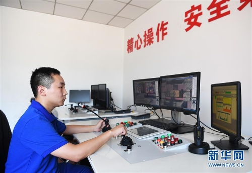 8月20日,重慶果園港工作人員通過(guò)智能場(chǎng)橋遠(yuǎn)控系統(tǒng)進(jìn)行集裝箱吊裝作業(yè)。新華社記者王全超/攝