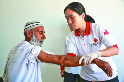3月27日,中國首支援助巴基斯坦醫(yī)療隊隊員在瓜達(dá)爾為一名當(dāng)?shù)啬凶涌床 V袊字г突固贯t(yī)療隊由中國原國家衛(wèi)生和計生委及中國紅十字會總會共同派出,共12人組成,于2017年9月抵達(dá)瓜達(dá)爾。新華社發(fā)