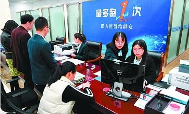順應(yīng)人民群眾呼聲,浙江提出“最多跑一次”改革。圖為浙江省臺州市行政服務(wù)中心的工作人員在給市民辦理業(yè)務(wù)。新華社發(fā)