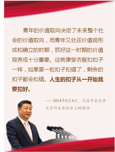 青年的價值取向決定了未來整個社會的價值取向,而青年又處在價值觀形成和確立的時期,抓好這一時期的價值觀養(yǎng)成十分重要。這就像穿衣服扣扣子一樣,如果第一粒扣子扣錯了,剩余的扣子都會扣錯。人生的扣子從一開始就要扣好。