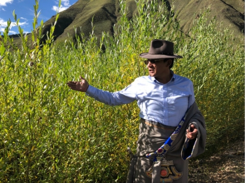 昂江多杰向記者介紹培育成功的藏柳樹苗 (余璐 攝)