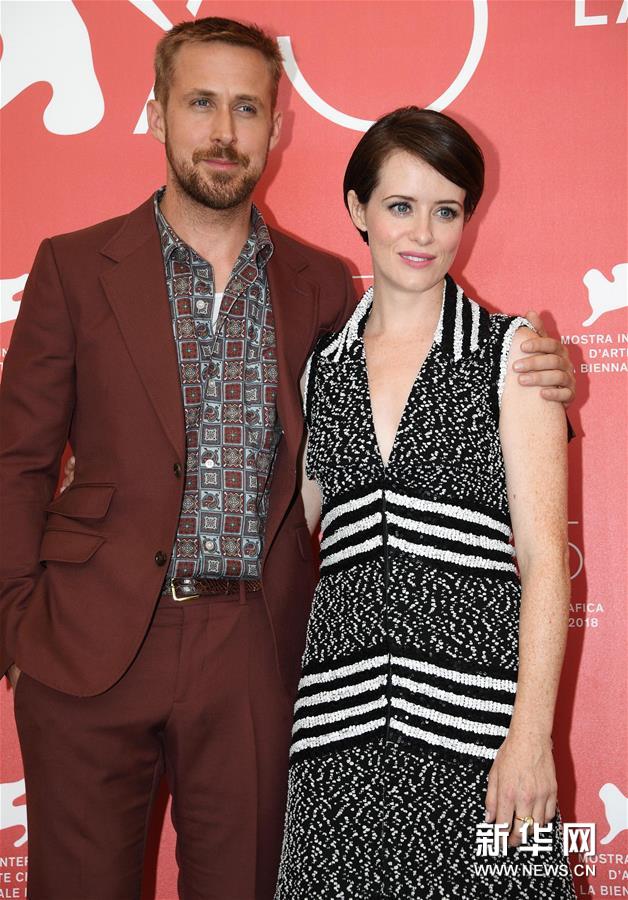 影片《第一人》演員瑞安·高斯林(左)和克萊爾·福伊出席媒體拍照式 新華社記者歐新攝
