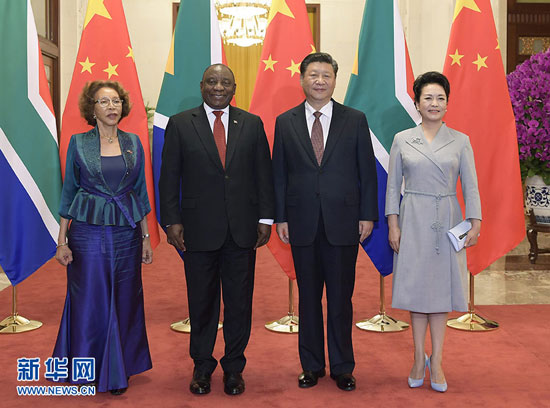 9月2日,國家主席習(xí)近平在北京人民大會(huì)堂同南非總統(tǒng)拉馬福薩舉行會(huì)談。這是習(xí)近平和夫人彭麗媛同拉馬福薩夫婦合影。 新華社記者李學(xué)仁/攝