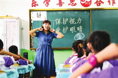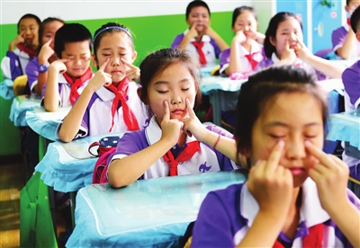 課堂上,老師指導(dǎo)孩子們眼保健操的正確做法,還講解了如正確的讀寫(xiě)姿勢(shì)、注意讀寫(xiě)的光線等保護(hù)眼睛的常識(shí),引導(dǎo)孩子們逐步養(yǎng)成護(hù)眼的好習(xí)慣。(記者萬(wàn)重 攝)