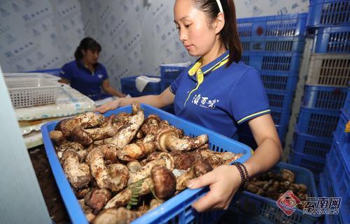 在云南木水花野生菌交易市場(chǎng),云南涵露菌業(yè)松茸經(jīng)營(yíng)戶正在忙著挑選整理銷往廣州的云南鮮松茸。