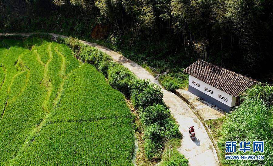 9月4日,陳春英騎摩托車前去領取學生們的營養(yǎng)餐(無人機拍攝)。