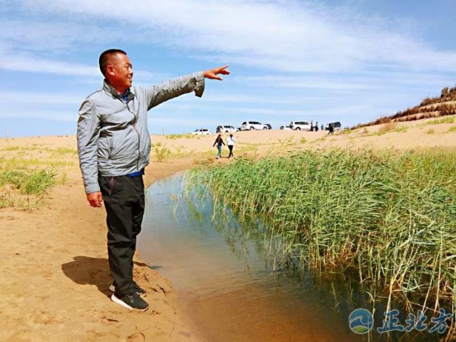 牧民那仁滿達(dá)胡向記者介紹沙漠環(huán)境的變化攝影/北方新報(bào)融媒體記者張巧珍