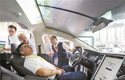 參觀(guān)者在2017年智博會(huì)上體驗(yàn)基于5G網(wǎng)絡(luò)的未來(lái)無(wú)人駕駛艙。(崔引 攝)