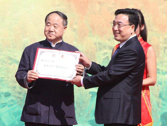 2013年山東高密第四屆紅高粱文化節(jié)上,莫言獲頒高密人民勛章