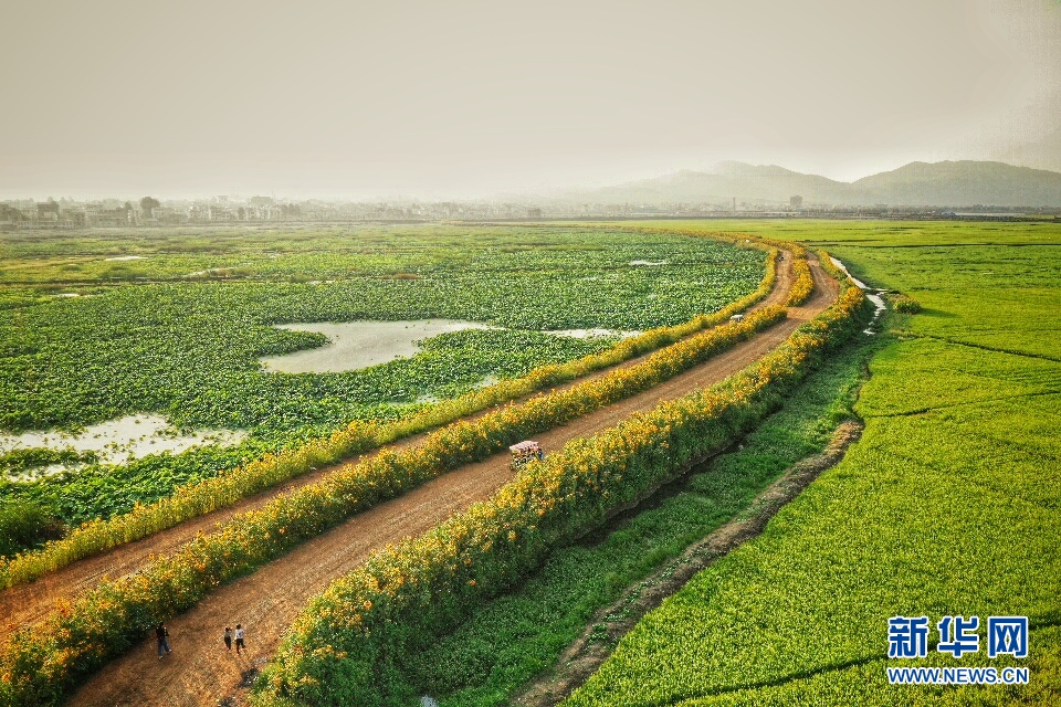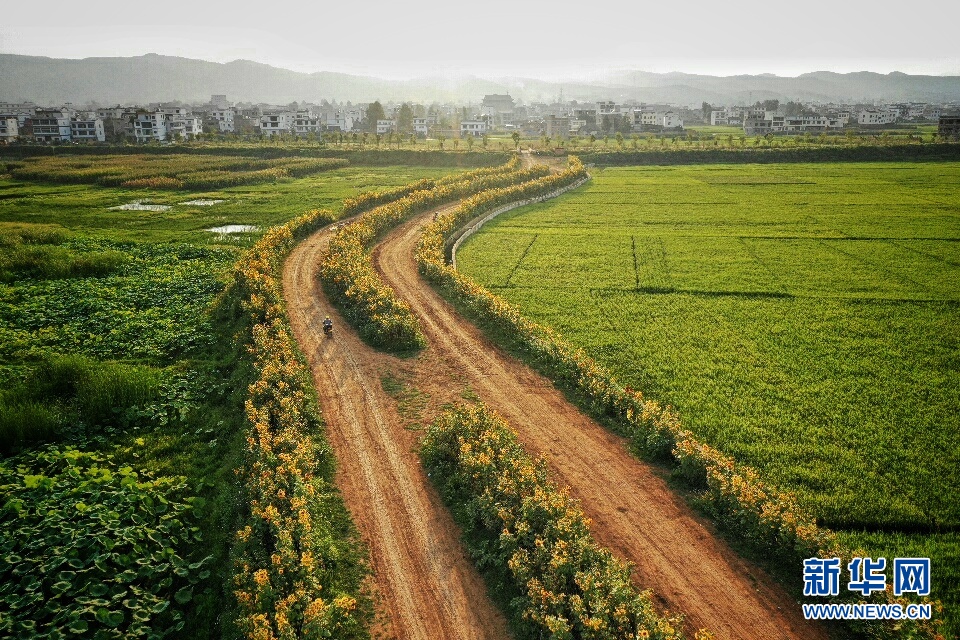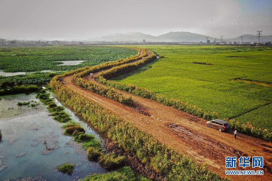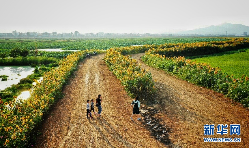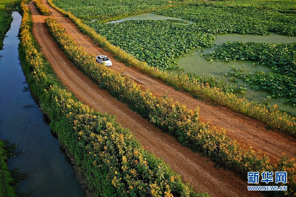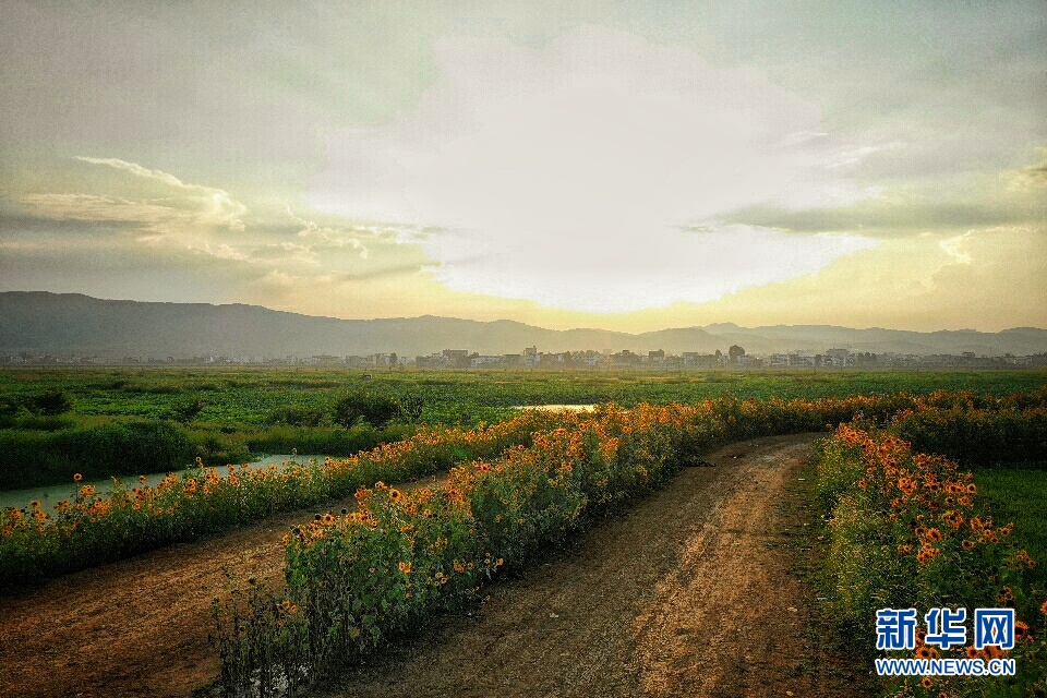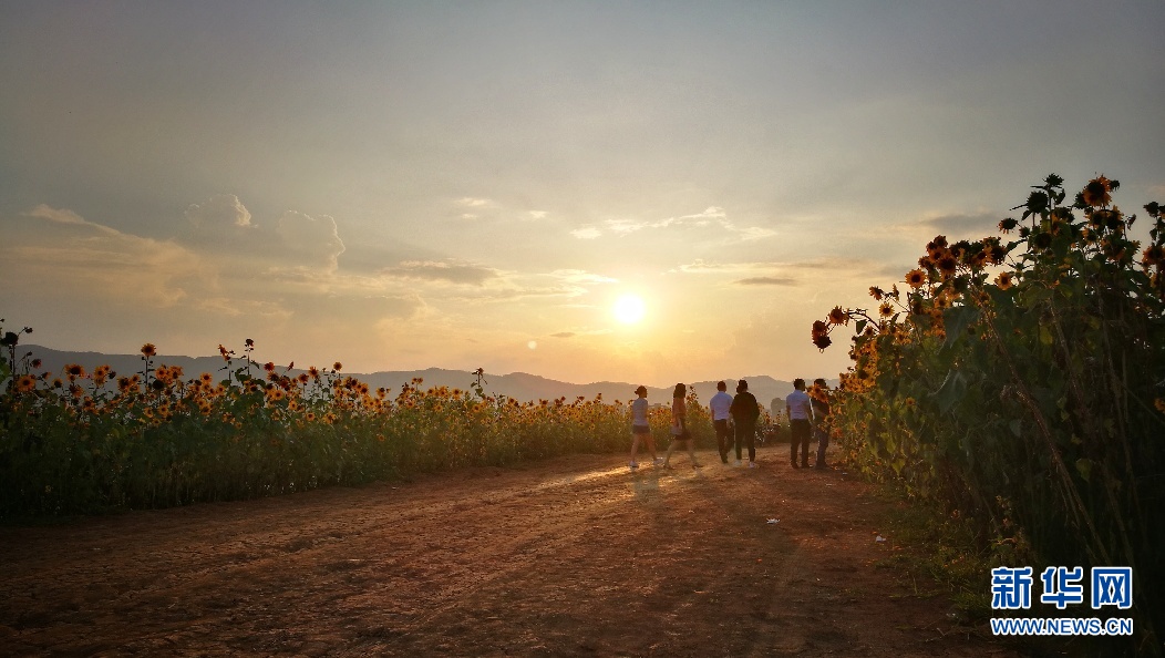 進入秋季,云南省昭通市昭陽區(qū)萬畝荷塘旁,小道兩邊的向日葵花進入盛開期,在夕陽的照射下仿佛涂抹了一層金色,充滿了夢幻般的色彩,每天吸引了不少市民前來觀景,成為當?shù)赜忠粋€季節(jié)性觀光點。(新華網(wǎng)發(fā) 左濱洪 攝)