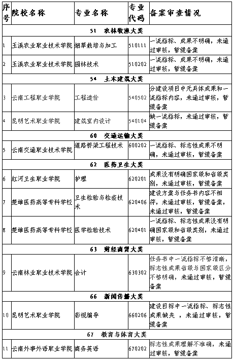 未通過審核暫緩備案的云南省高等職業(yè)教育高水平骨干專業(yè)名單