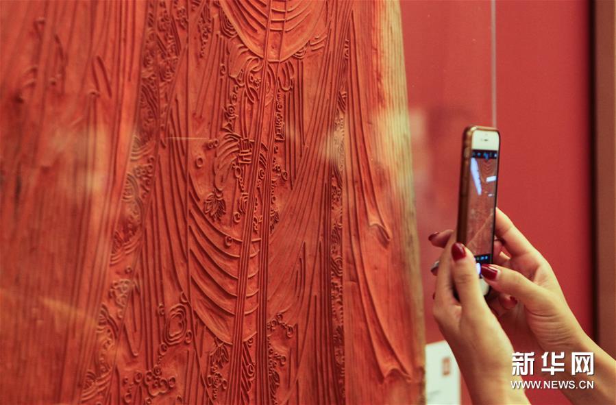 9月5日,觀眾在展覽上拍攝一塊展出的雕版。當(dāng)日,由中國(guó)非物質(zhì)文化遺產(chǎn)保護(hù)協(xié)會(huì)、中國(guó)古籍保護(hù)協(xié)會(huì)、杭州市文化廣電新聞出版局主辦,杭州十竹齋藝術(shù)館承辦的“中國(guó)印刷術(shù)的活化石:十竹齋木版水印藝術(shù)作品展”在中國(guó)美術(shù)館開(kāi)幕?!妒颀S二十四節(jié)氣水印版畫(huà)》同時(shí)被中國(guó)美術(shù)館和中國(guó)國(guó)家圖書(shū)館收藏。展覽通過(guò)杭州十竹齋藝術(shù)館的經(jīng)典作品展現(xiàn)木版水印技藝畫(huà)、刻、印過(guò)程中的精妙與典雅,展現(xiàn)中國(guó)非物質(zhì)文化傳統(tǒng)技藝的博大精深。作為2017年度國(guó)家藝術(shù)基金傳播交流推廣資助項(xiàng)目,“十竹齋木版水印藝術(shù)作品展”由國(guó)家級(jí)非物質(zhì)文化遺產(chǎn)代表性傳承人、杭州十竹齋藝術(shù)館館長(zhǎng)魏立中歷經(jīng)30年傾力打造。 2014年,十竹齋“木版水印技藝”入選第四批國(guó)家級(jí)非物質(zhì)文化遺產(chǎn)代表性項(xiàng)目名錄。 2017年12月,魏立中入選第五批國(guó)家級(jí)非物質(zhì)文化遺產(chǎn)代表性項(xiàng)目木版水印技藝代表性傳承人。