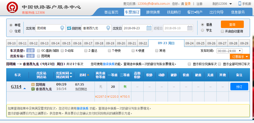 春城晚報記者在12306官網(wǎng)上看到,9月23日G314號(昆明南—香港西九龍)高鐵首發(fā),上午9:19從昆明南出發(fā),下午16:54抵達香港西九龍站,可以趕上去香港吃晚餐了。