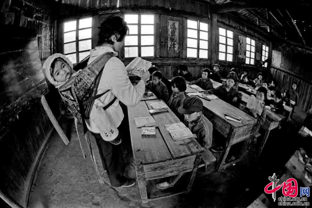 1987年4月,廣西壯族自治區(qū)融水縣安太鄉(xiāng)寨懷村小學(xué),戴紅英老師背著不滿五個(gè)月的小女兒上課。