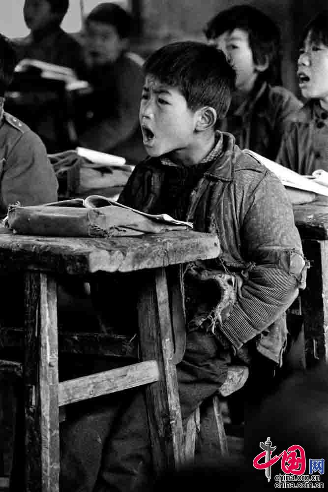 1991年4月,河南省新縣八里畈鄉(xiāng)王里河小學(xué),胡善輝(大鼻涕 8歲)在大聲朗讀課文。