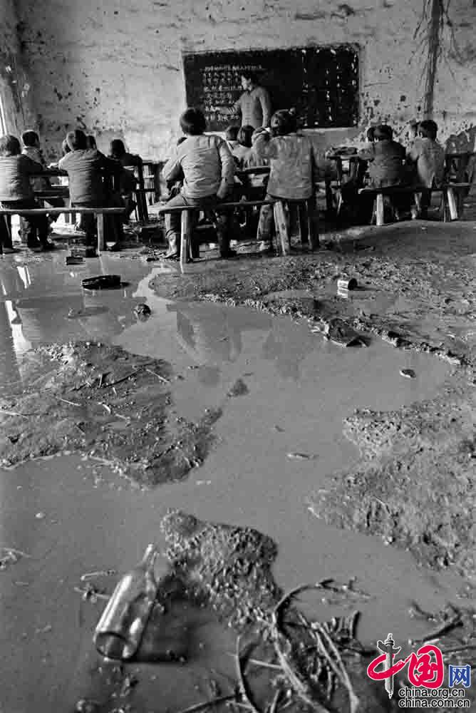 1991年4月,湖北省紅安縣七里坪鎮(zhèn)周七家小學(xué),一場(chǎng)春雨教室便一片泥濘,孩子們繼續(xù)上課。