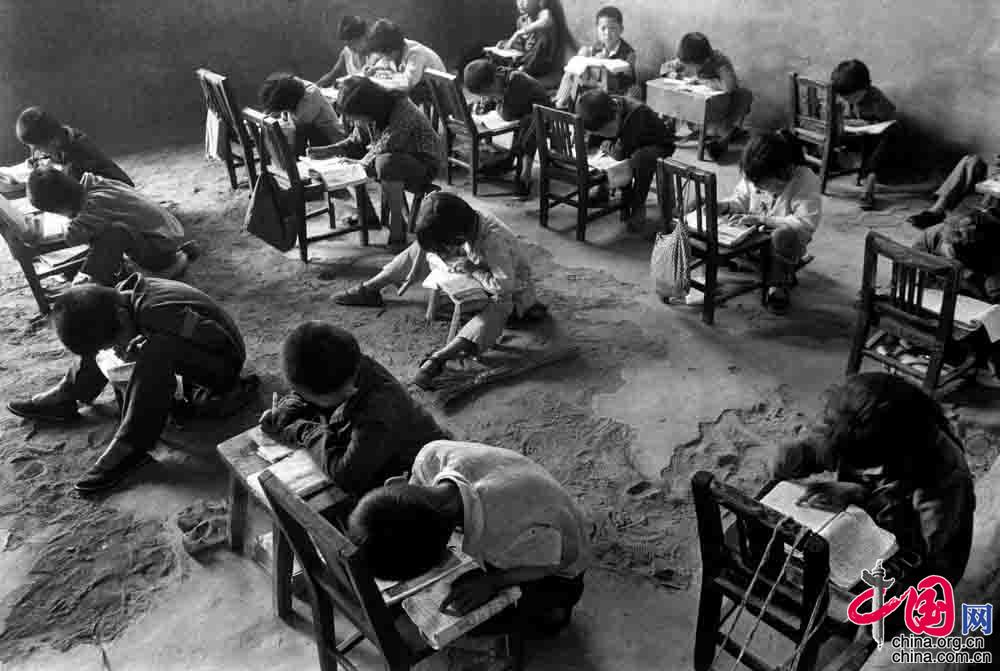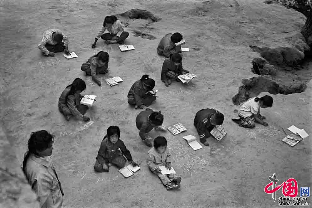 1991年9月,陜西省佳縣賀家?guī)r村小學(xué),遇到陰天,教室里便很昏暗,學(xué)生們就在室外上課。