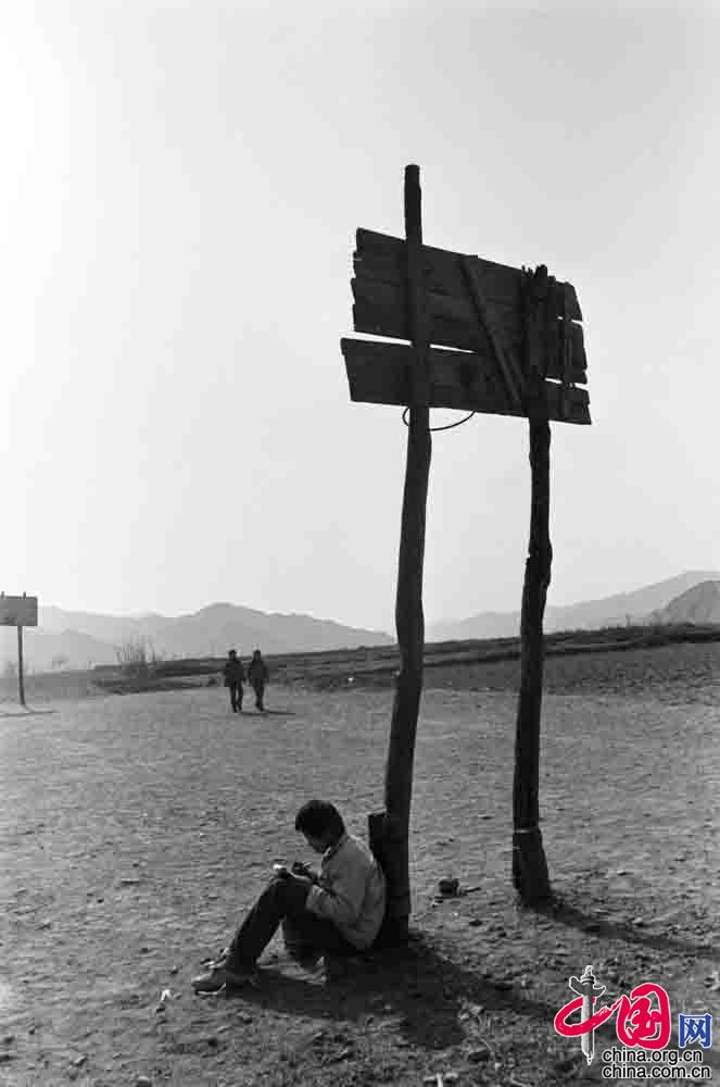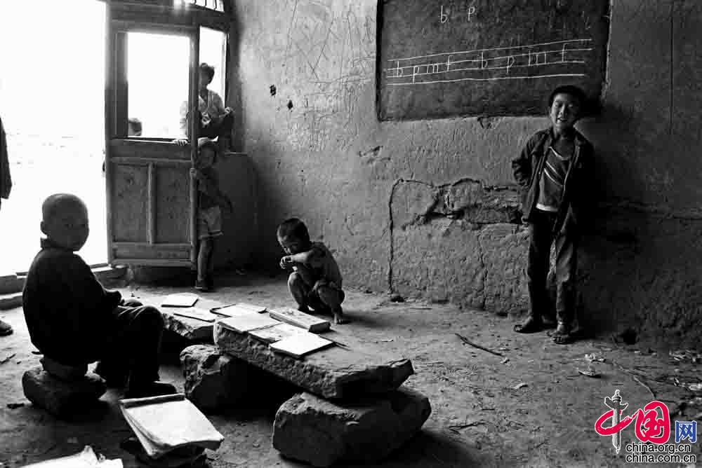 1991年9月, 陜西省佳縣王家?guī)r村小學(xué), 這里沒有桌凳 ,只有石頭和書。