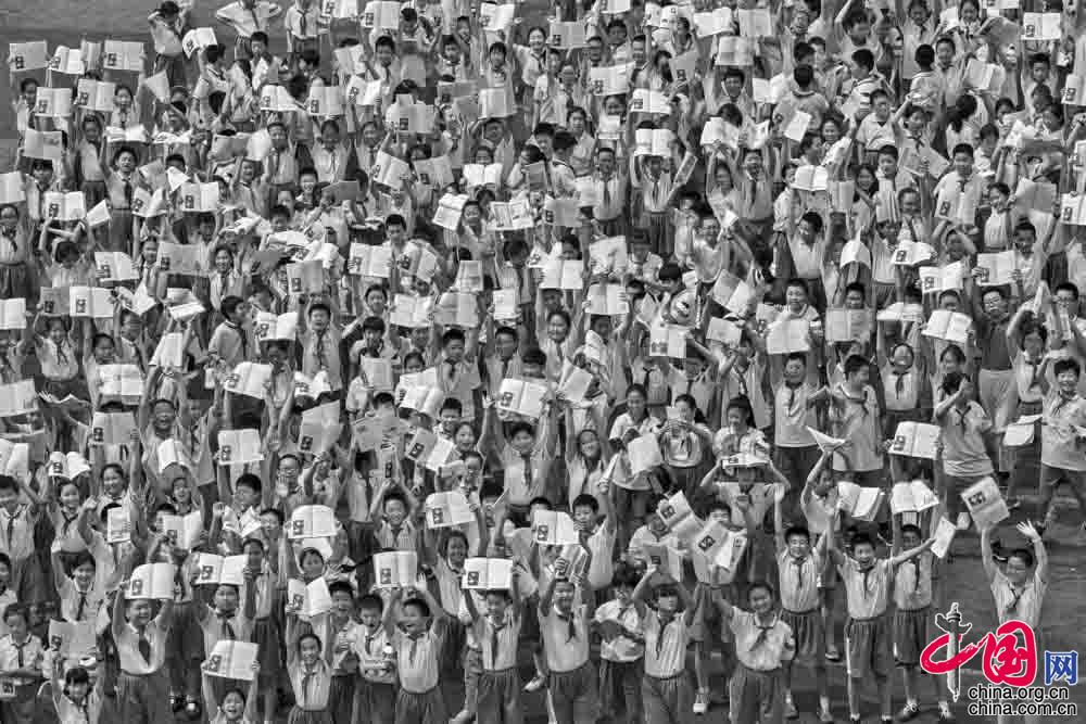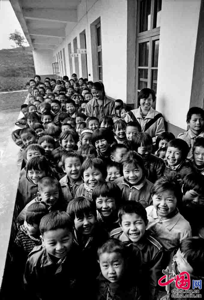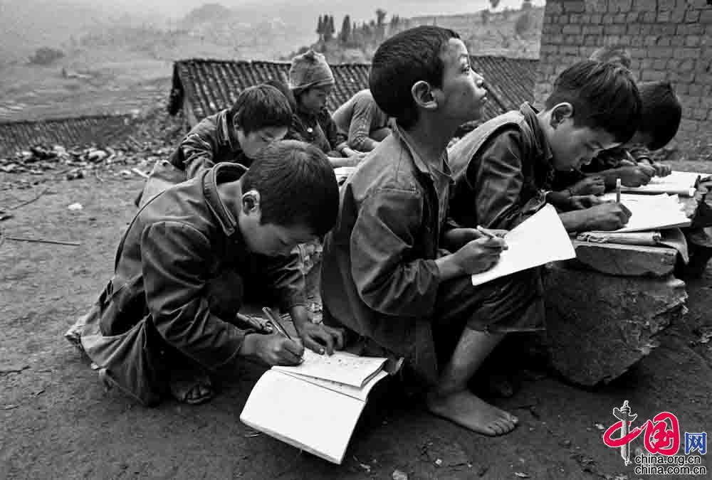 1993年12月, 河北省阜平縣下莊小學(xué), 利用課余時(shí)間在操場(chǎng)上復(fù)習(xí)功課的孩子。