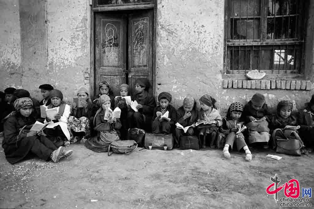 1995年4月 ,新疆維吾爾自治區(qū)疏勒縣 ,孩子們很早到校早自習(xí)。