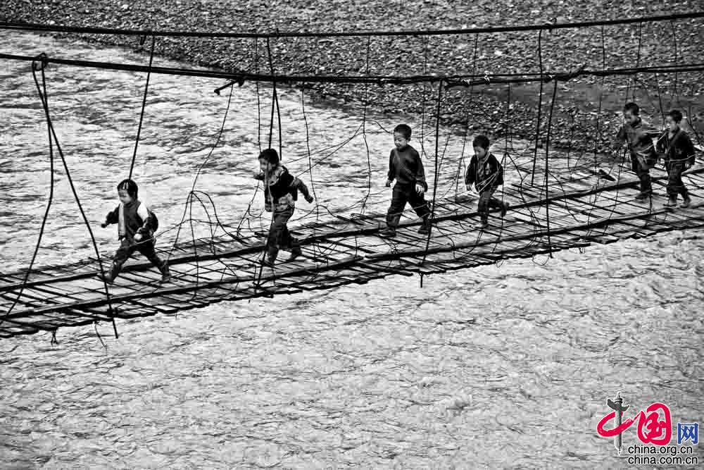 2006年9月, 四川省涼山州昭覺縣庫(kù)依鄉(xiāng), 孩子們小心翼翼地走過極其簡(jiǎn)陋的懸索橋去上學(xué)。