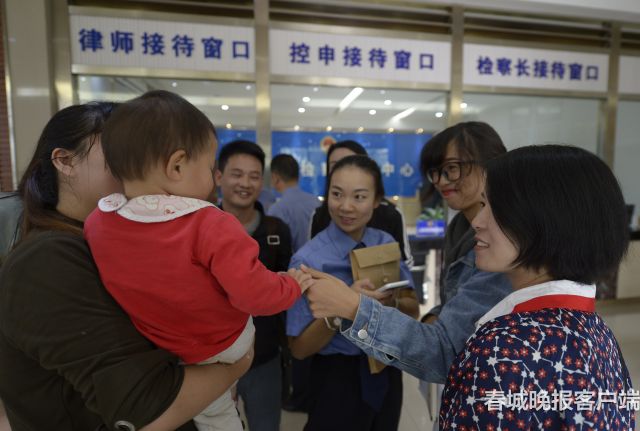 檢察院工作人員和記者們和李女士的兒子玩耍