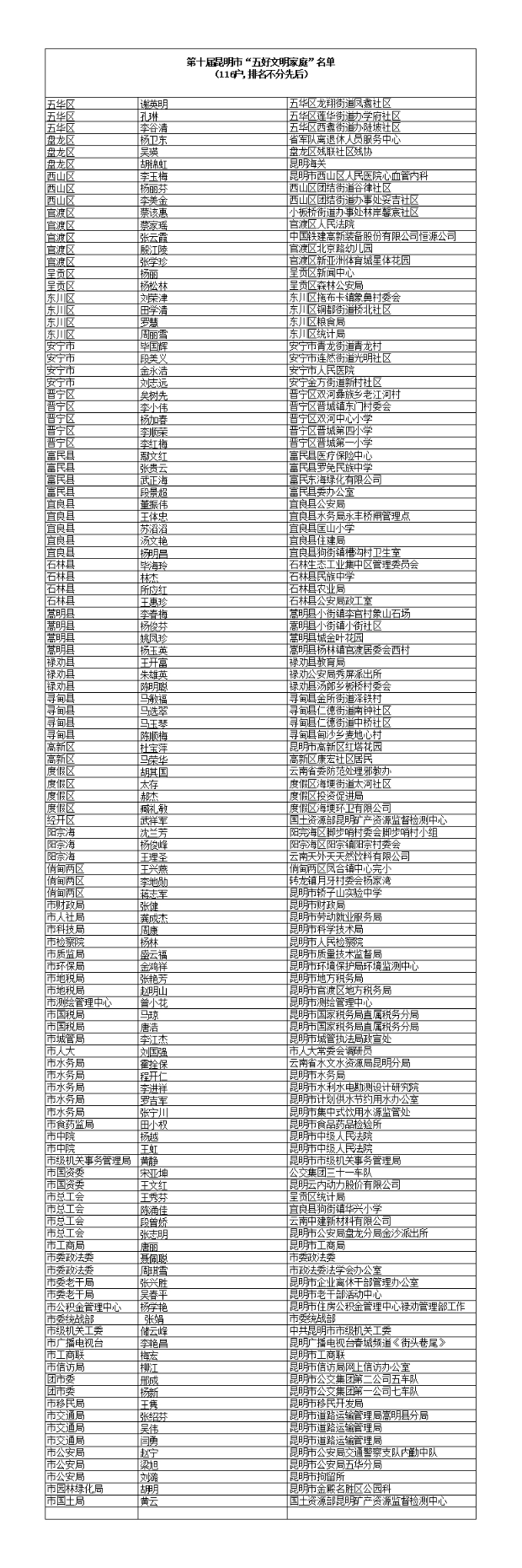 為表彰先進(jìn),樹立榜樣,9月9日昆明市“五好文明家庭”創(chuàng)建活動(dòng)領(lǐng)導(dǎo)小組決定,授予陳林松等116戶家庭為第十屆昆明市“五好文明家庭”榮譽(yù)稱號(hào)。