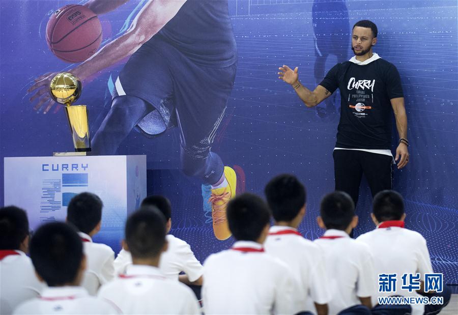 9月10日,庫里與小球員分享心得。 當日,NBA金州勇士隊球員庫里現(xiàn)身武漢室內(nèi)運動場,與華中科技大學附屬中學的小球員互動交流。新華社記者肖藝九攝