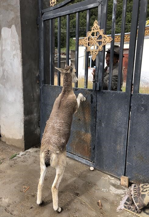 68歲的雜多縣昂賽鄉(xiāng)老獸醫(yī)求軍結(jié)束了一天的工作,背著沉重的藥箱回到家中,關(guān)上庭院大門的一刻,一只可愛的小巖羊突然躥了出來(lái),趴在大門上撒著嬌,不愿離去。
