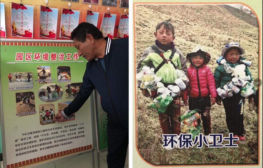圖左為昂塞鄉(xiāng)鄉(xiāng)長(zhǎng)旦增文秀向記者介紹“垃圾換文具”活動(dòng),圖右為學(xué)校評(píng)選出的“環(huán)保小衛(wèi)士”。人民網(wǎng)記者余璐/攝