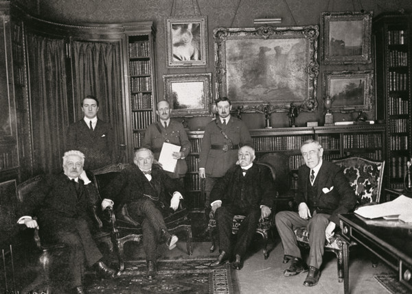 1919年,巴黎和會(huì)期間,美國(guó)總統(tǒng)托馬斯·伍德羅·威爾遜(前排右一)與參會(huì)的其他國(guó)家領(lǐng)導(dǎo)人。