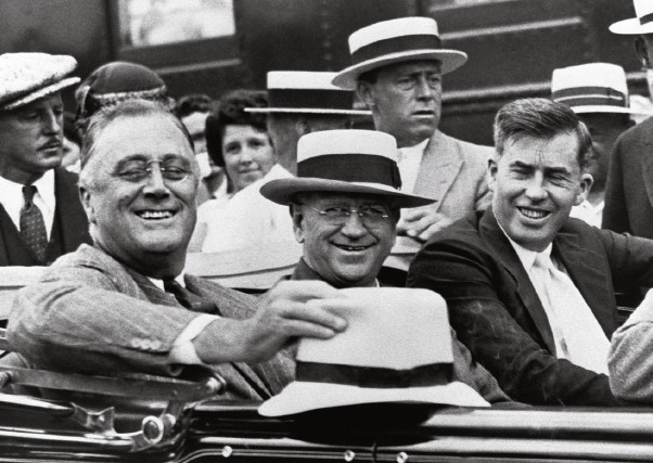 1933年,美國(guó)總統(tǒng)富蘭克林·德拉諾·羅斯福(左)與內(nèi)政部長(zhǎng)哈羅德·L·伊克斯(中)、農(nóng)業(yè)部長(zhǎng)亨利·A·華萊士(右)乘坐一輛汽車。當(dāng)時(shí)正值羅斯福新政初期。