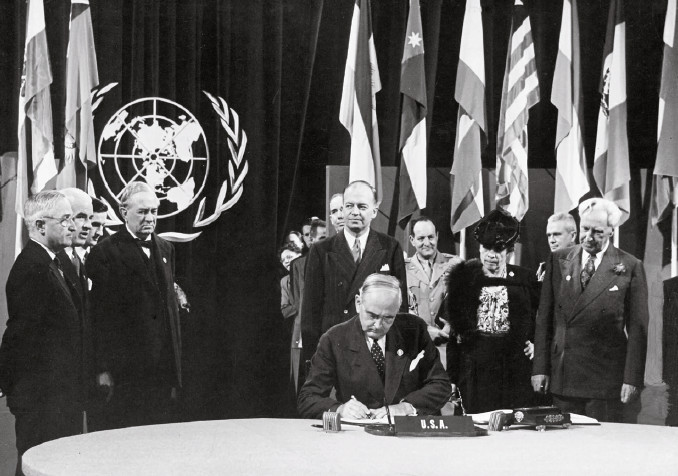 1944年夏,在羅斯福的邀請(qǐng)下,美蘇英和中美英三國(guó)會(huì)議先后于華盛頓附近的敦巴頓橡樹(shù)園舉行。會(huì)議建議未來(lái)的國(guó)際組織名稱為“聯(lián)合國(guó)”,規(guī)定了聯(lián)合國(guó)的宗旨和原則,以及聯(lián)合國(guó)大會(huì)、安全理事會(huì)等主要機(jī)構(gòu)的組織和職權(quán)。1945年6月26日,《聯(lián)合國(guó)憲章》簽字儀式在舊金山舉行,美國(guó)作為東道國(guó),最后一個(gè)簽字。然而,手執(zhí)簽字筆的并不是羅斯福,而是他的繼任者杜魯門(mén)——兩個(gè)多月前,羅斯福因突發(fā)腦溢血離世。