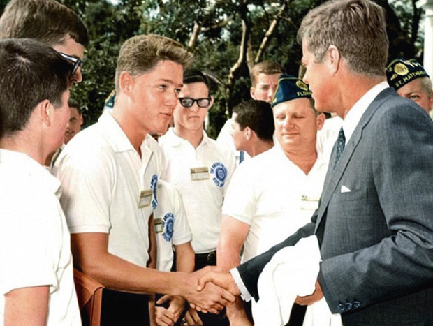 克林頓天生是個(gè)學(xué)霸,青年時(shí)期就以杰出學(xué)生之名受到過(guò)時(shí)任總統(tǒng)肯尼迪(右)接見(jiàn)。