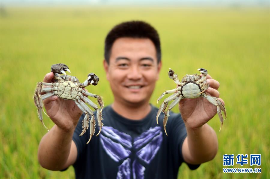 9月15日,河北省唐山市曹妃甸區(qū)第一農(nóng)場職工展示從水稻田中捕撈的稻田蟹。 新華社記者馬寧/攝