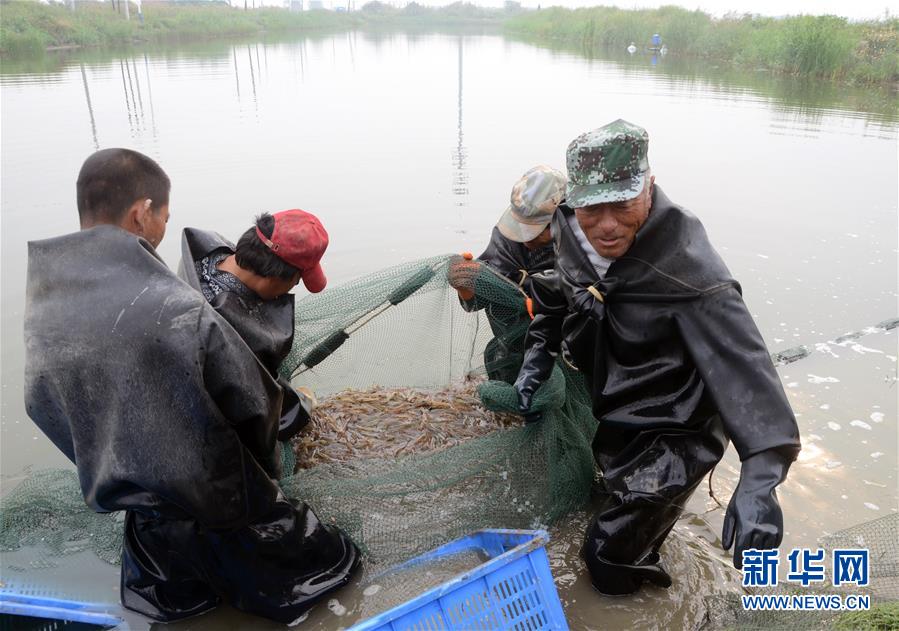 9月15日,河北省唐山市曹妃甸區(qū)第一農(nóng)場職工從水塘中捕撈養(yǎng)殖的對蝦。 新華社記者馬寧/攝