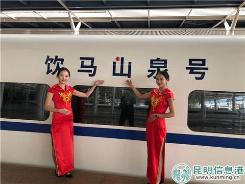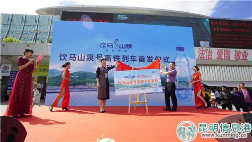 昆明信息港訊 記者上官艷君 9月17日10時零5分,一列裝扮一新的高鐵列車從昆明南站始發(fā),這趟途徑楚雄開往大理的D8689次高鐵列車,就是本次冠名的“飲馬山泉號”首發(fā)列車。