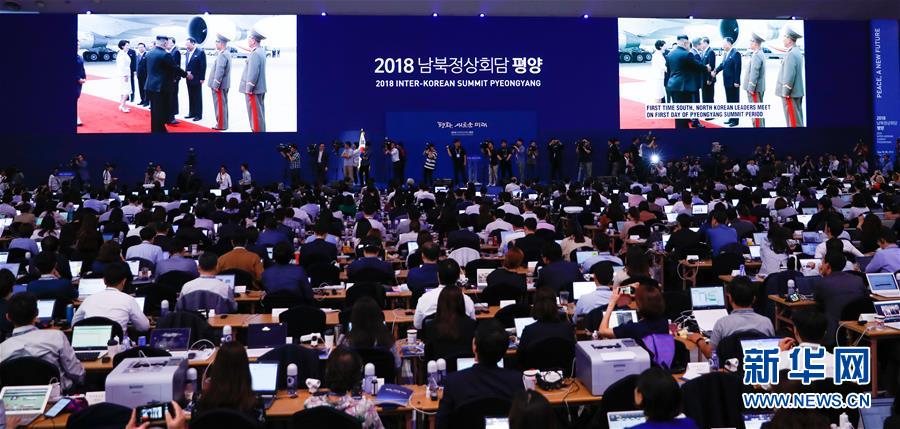 9月18日,在韓國首爾,記者在新聞中心觀看韓國總統(tǒng)文在寅抵達平壤的電視直播。新華社記者王婧嬙 攝