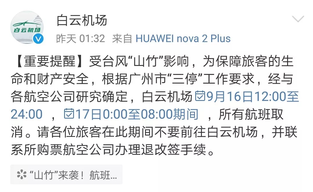 廣州白云機(jī)場(chǎng)16日宣布取消16日12:00至17日8:00的所有航班。