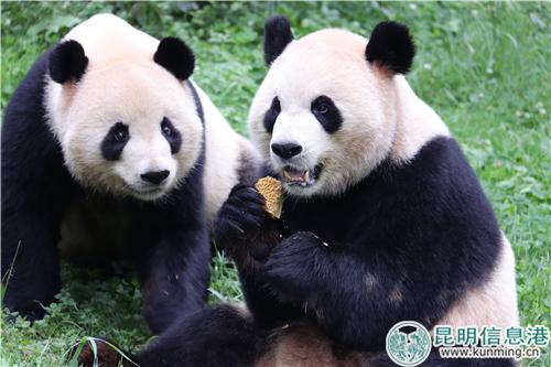 大熊貓“毛竹”和“珍多”一起吃月餅。