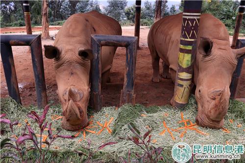 白犀牛一口吃下苜蓿草月餅。