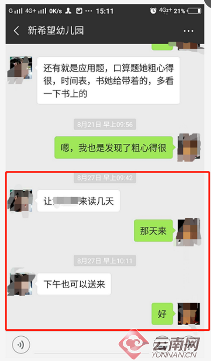 8月27日,張猛收到幼兒園園長(zhǎng)鄭某某發(fā)送過來的微信消息稱,叫他把孩子送到學(xué)校再上兩天學(xué)?!翱吹较⒑?我覺得這名老師挺負(fù)責(zé)任的,就讓孩子奶奶將其送到幼兒園上課?!睆埫徒忉屨f,8月25日這所幼兒園就開學(xué)了,小學(xué)是9月1日才開學(xué)。當(dāng)?shù)赜變簣@學(xué)生在升小學(xué)前會(huì)進(jìn)行一次學(xué)前測(cè)試,以此測(cè)驗(yàn)孩子的學(xué)習(xí)水平。