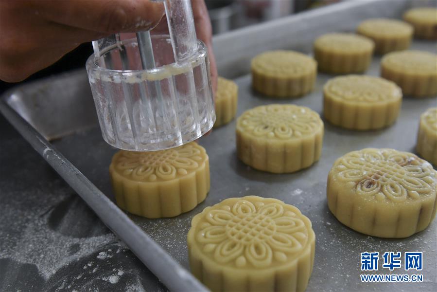 9月19日,新疆伊寧市實大實點心店老板馬川在制作月餅。新華社記者王菲攝