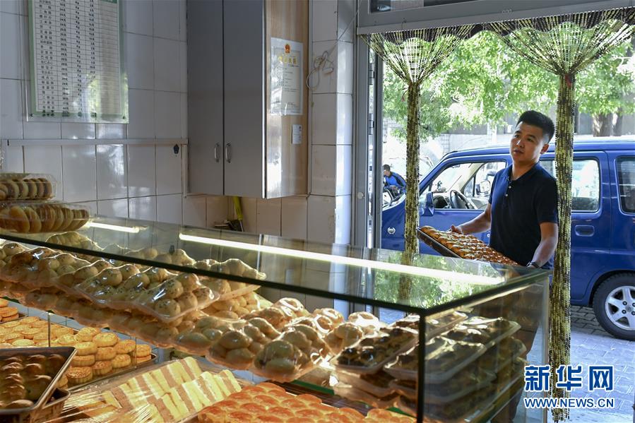 9月19日,新疆伊寧市實大實點心店老板馬川往店里擺放月餅。新華社記者王菲攝